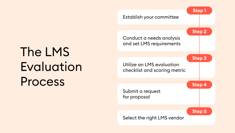 Step 1. Establish your committee The LMS evaluation and selection process is a team effort. It is critical that you assemble an advisory council of key stakeholders to discuss and deliberate on the evaluation process. Choosing the right individuals for your committee will give you a much better sense of your organizational needs.