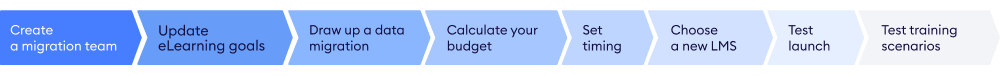 Step 1. Create an LMS migration team LMS users : If you’ve used your LMS long enough, the company’s employees can definitely provide you with feedback. This is a good time to create a safe space to listen to their joys and sorrows with regard to their learning experiences. Create a user group from different departments and discuss what teachers and employees do and don’t like about your current system.Stakeholders : Make sure to bring key stakeholders with you to see what they expect from the eLearning process in your company. Task force : There’s plenty of work to do: you need to extract data, communicate with LMS vendors, create new content, and so on. To get all things done in time, assign responsibility to your coworkers for a successful LMS migration. Step 2. Update eLearning goals Define all the business and training needs that you want to cover after upgrading the eLearning environment in your company. What if existing eLearning goals need to be revised? This is the best moment to adopt the new strategy. Spotlight current weak points and problems. But remember that your objectives need to be realistic.